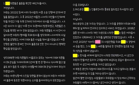 On the 21st, all employees of the restaurant run by Seo Joo-won posted a long article on the anonymous community ‘Blind’, saying, “I want to correct the misunderstanding about restaurants.”