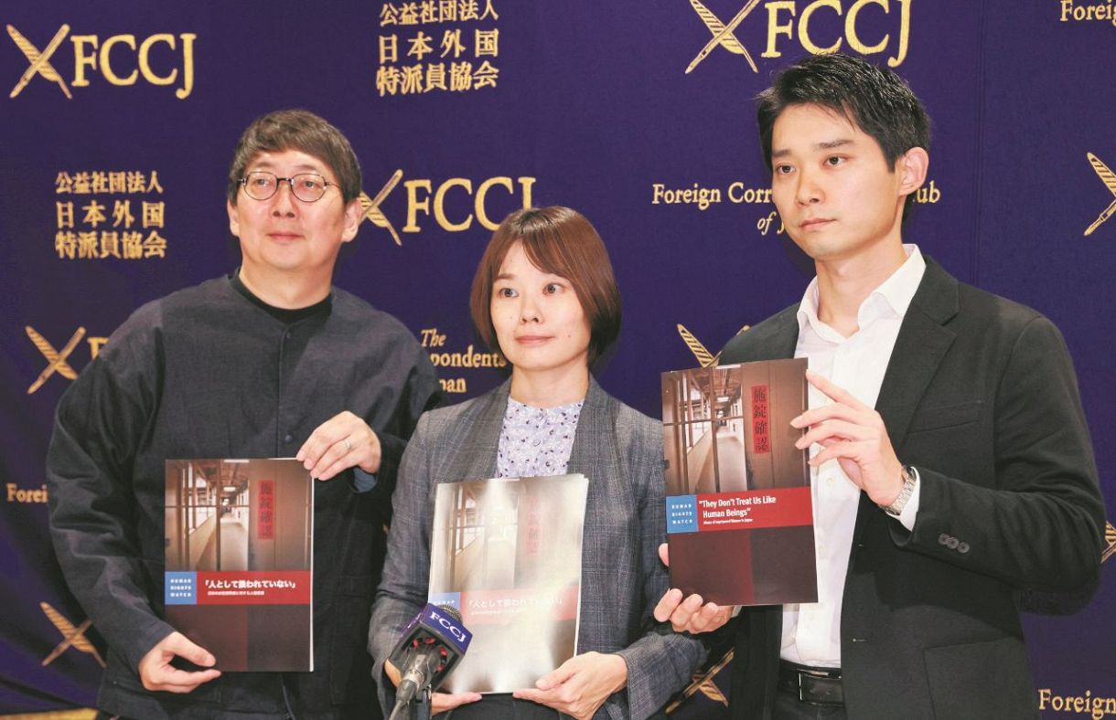 Holding a press conference on human rights in women’s prisons (from right) Teppei Kasai of Human Rights Watch, lawyer Ayuko Takato, and Goro Furuto, executive director of the Japan Drug Policy Advocacy Network.