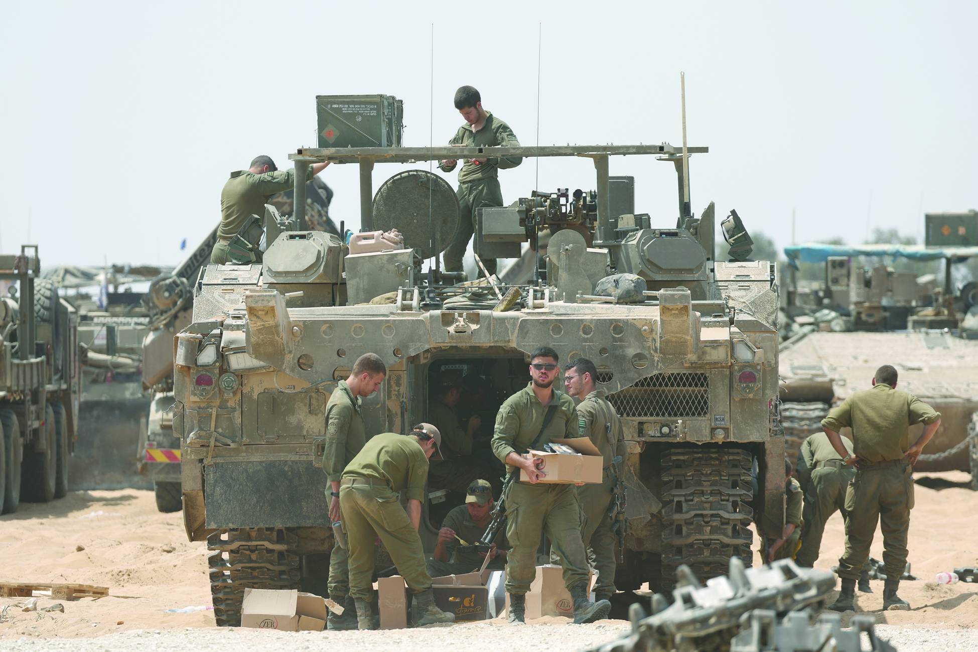 Israeli soldiers inspect military equipment at a site on the southern border with the Gaza Strip near Rafah (AP)