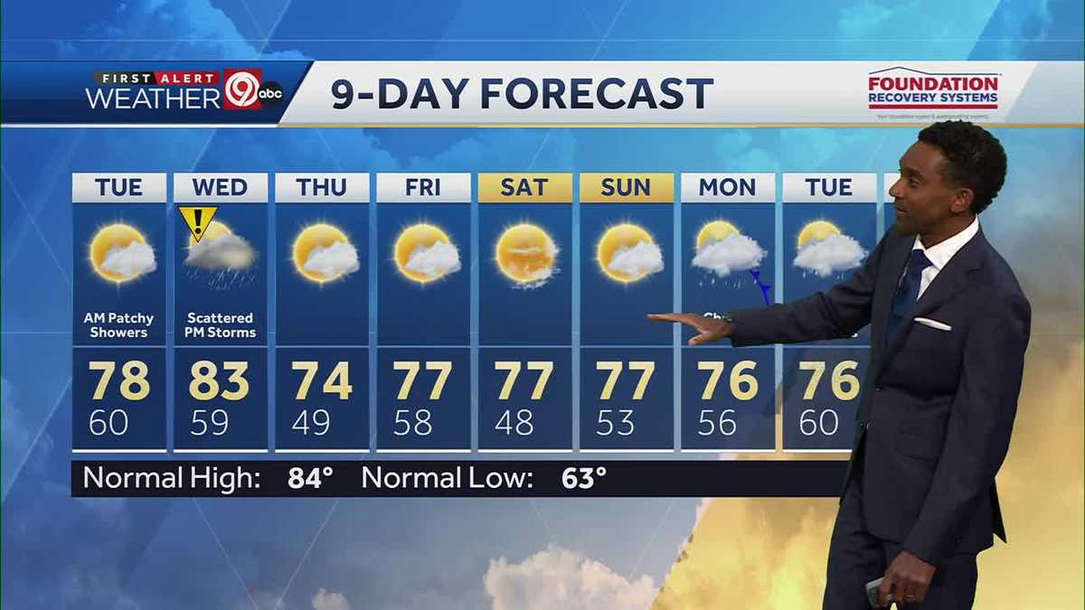 Occasional, patchy showers are expected to persist through the evening. The current forecast indicates a slow clearing trend for Tuesday,with cooler-than-normal temperatures continuing. Wednesday’s cold front poses a risk of more intense storms before the arrival of drier, autumnal air.