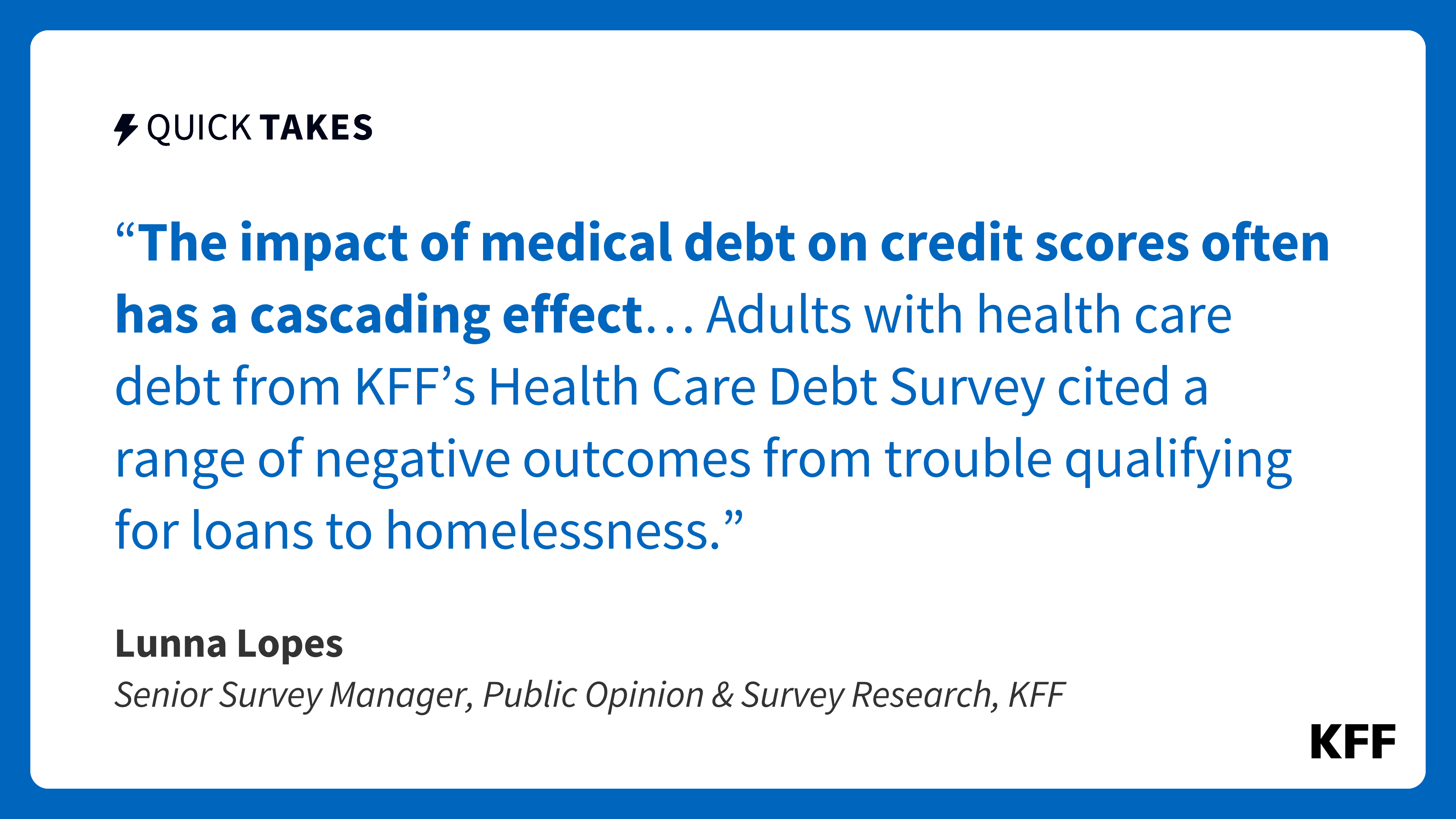 disproportionate Impact on Credit Scores: more than a third of adults with healthcare debt reported that it negatively affected their credit score. This impact is even higher for Black adults (46%) and those who incurred debt while uninsured (40%).