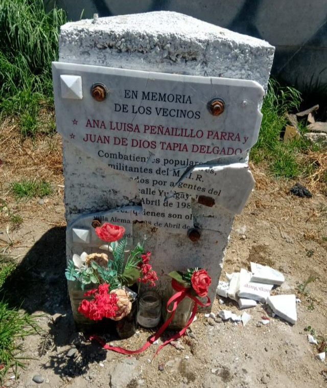 On said plaque, located on a concrete monolith, the following was written: “In memory of the neighbors Ana Luisa Peñailillo Parra and Juan de Dios Tapia Delgado, popular combatants, MIR militants, exploded by State agents at 1150 Yungay Street on April 28, 1986. ‘Only those who are forgotten die.’ Villa Alemana April 28, 2023”
