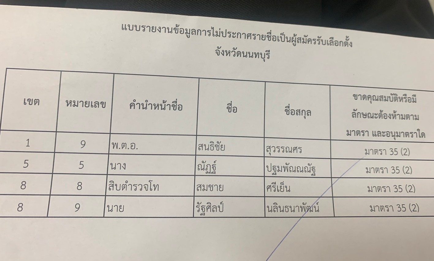 The Election Commission of Nonthaburi disqualified 4 MP candidates for not exercising the right to vote in the latest election.