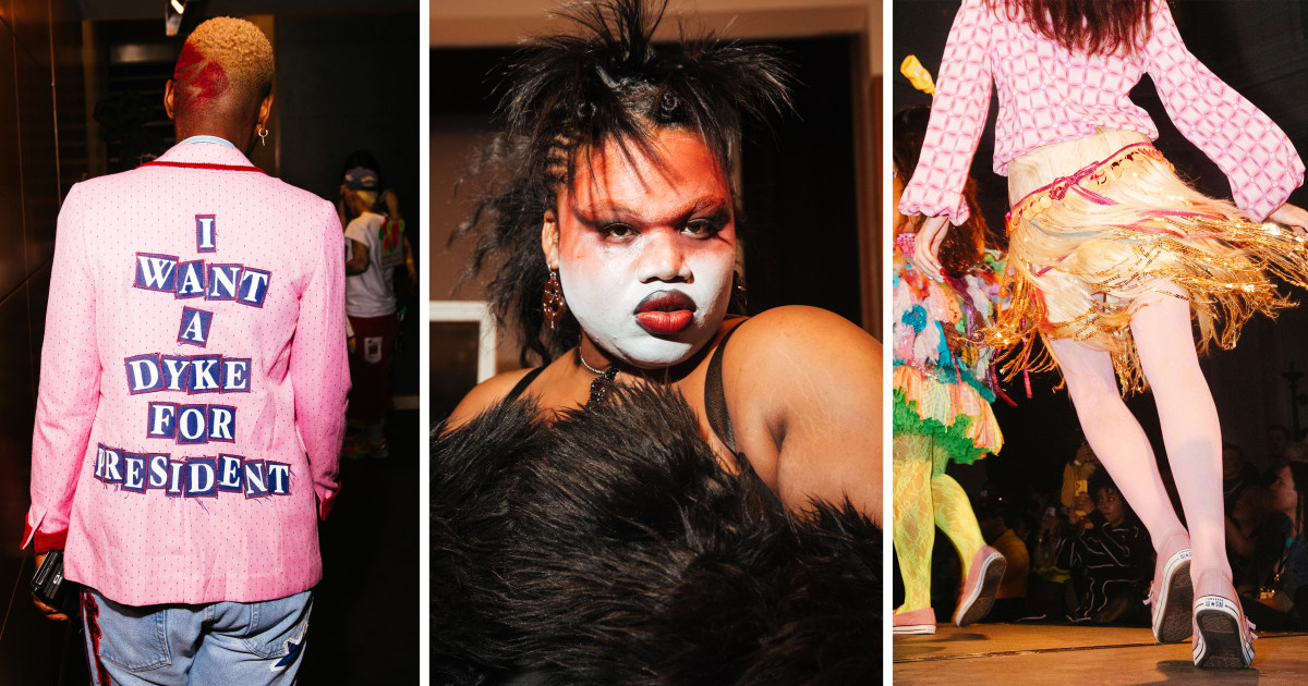 Fi Black, founder of dykemint, offered a different kind of advice for navigating the current political climate: “Marry your first love. Get your first divorce.” Black and their wife, Lita Bacus, who now co-runs the brand, recently wed in April while simultaneously designing their “Butches Contain Multitudes” collection. The runway featured collaged elements, shining colors, vibrant beading, and recycled materials.