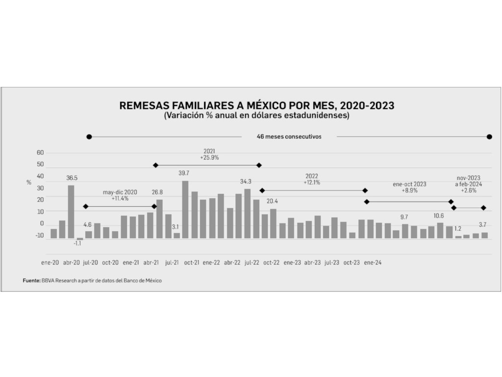 In February, remittances accumulated a streak of 46 consecutive months of annual increases, highlighted the BBVA analysis area; however, they show signs of slowing down