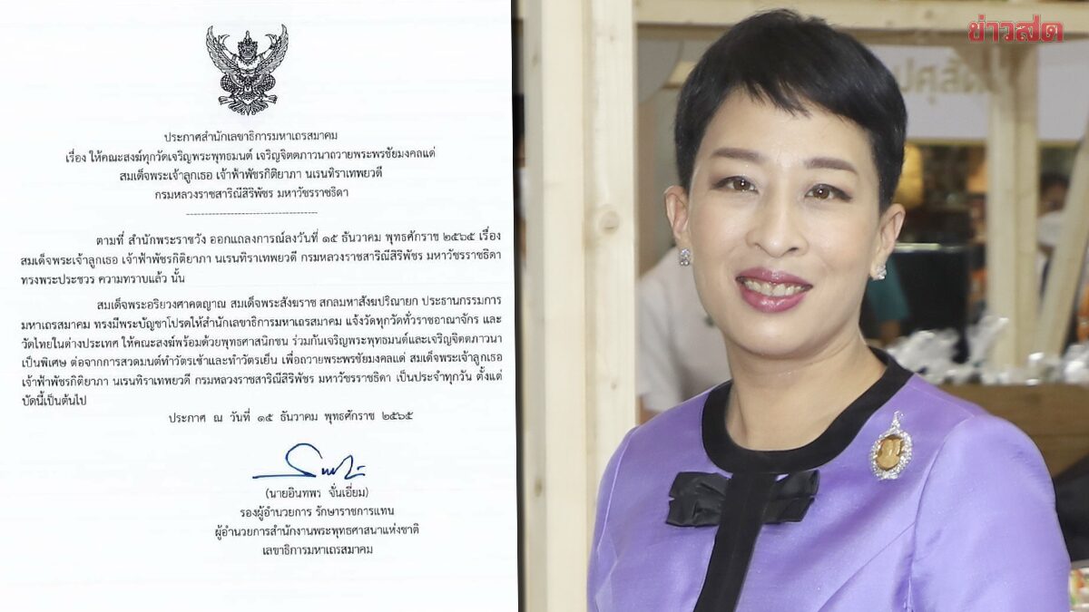 Somdet Phra Ariyavongsagatanana Supreme Patriarch Sakol Maha Sangha Parinayok Chairman of the Sangha Council His Highness Commanded the Secretariat of the Supreme Sangha Council Advise all temples across the Kingdom and Thai temples abroad for monks along with Buddhists together to make the Buddha and Prosper After morning prayers and evening prayers give blessings to HRH Princess Maha Chakri Sirindhorn Prince Patcharakitiyabha Narendira Thep Yowadee Kromluang Ratchasarinee Siriphat Maha Watcharajthida every day From now on, announced 15 December 2022