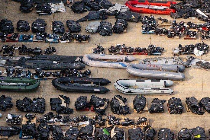 An aerial view of inflatable craft, used by migrants to cross the channel, stored at a Border Force facility in Dover.Credit: Getty Images