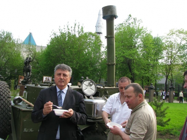 The celebration continued in the courtyard of the studio, where everyone received a soldier’s porridge of buckwheat, prepared in a field kitchen, as well as the front ration of vodka.